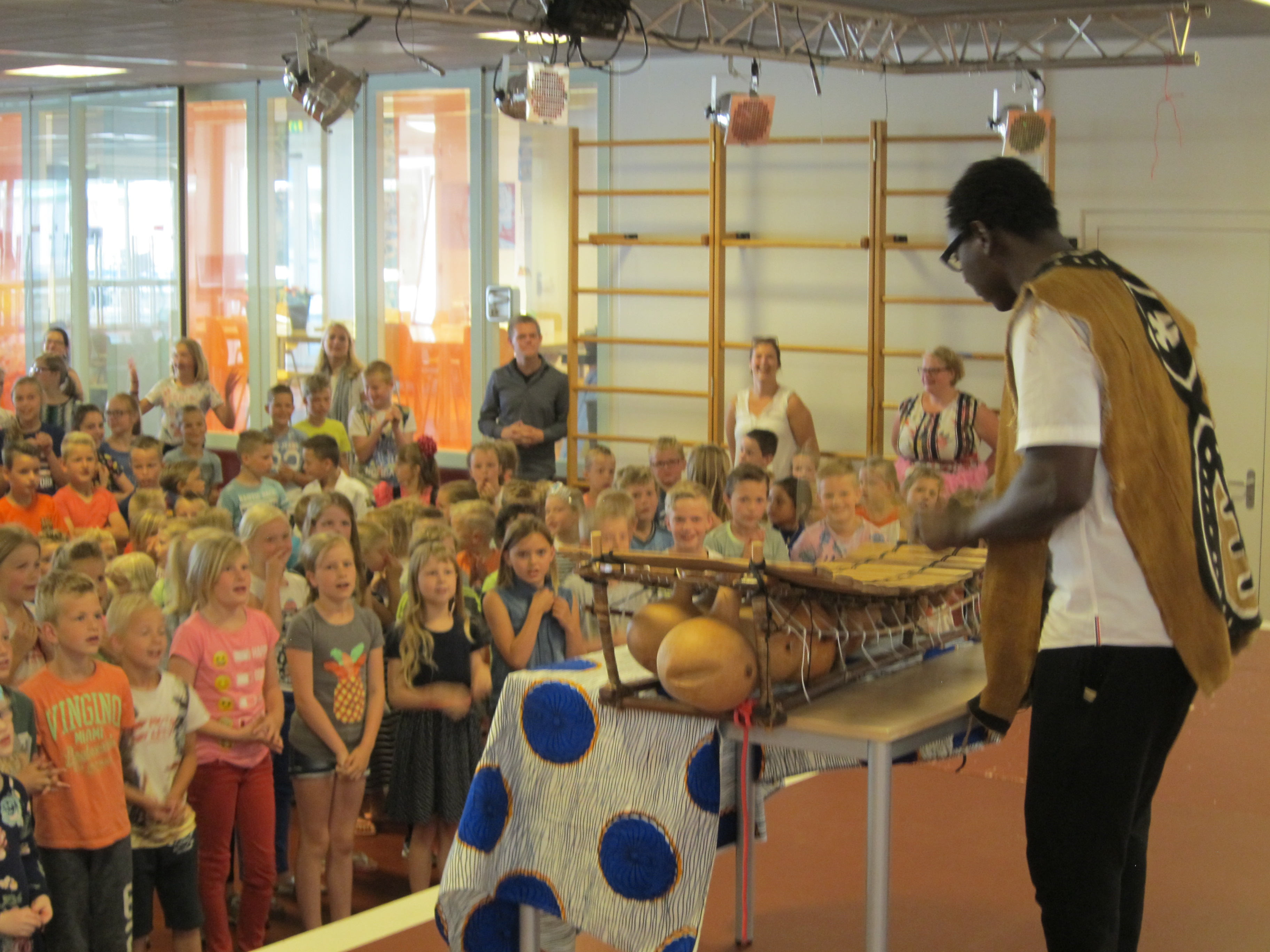 De schooljeugd werd door Salia verrast met een djembe workshop. Er werd veel gelachen, gezongen en getrommeld op de tafels.